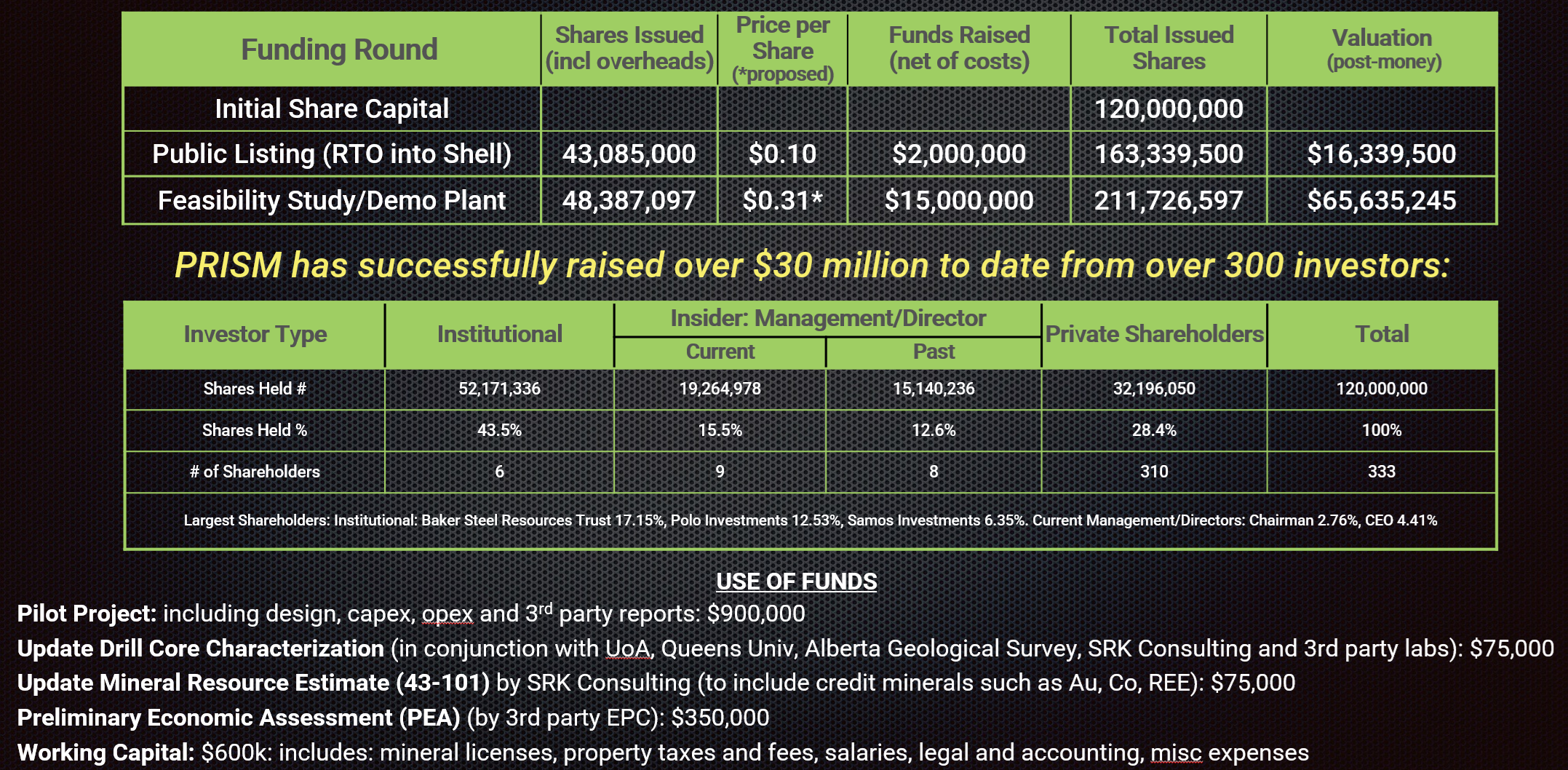 PRISM is currently undertaking a fundraising of $2million in order to progress with the Pilot plant at Innotech Alberta. Please see below the current share capital table and valuation.